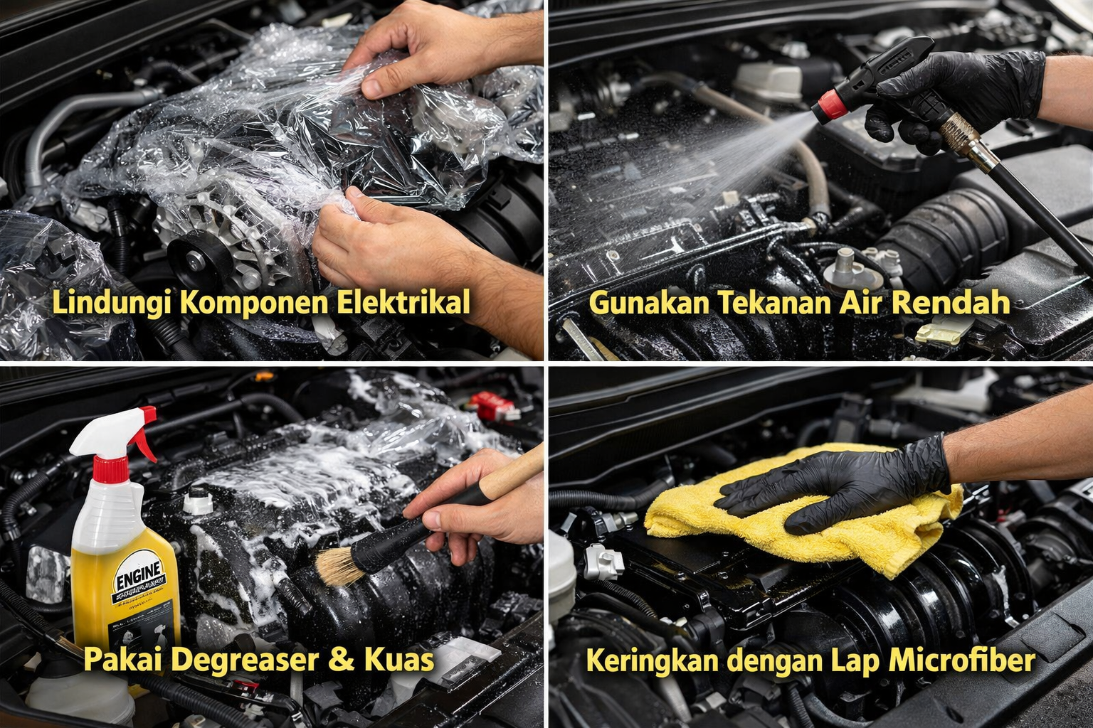 Bagi pemilik kendaraan yang ingin membersihkan ruang mesin sendiri, berikut langkah-langkah aman yang bisa diterapkan: